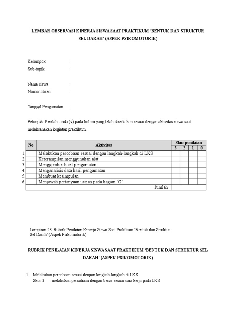 Lembar Observasi Kinerja Siswa Saat Praktikum Pdf